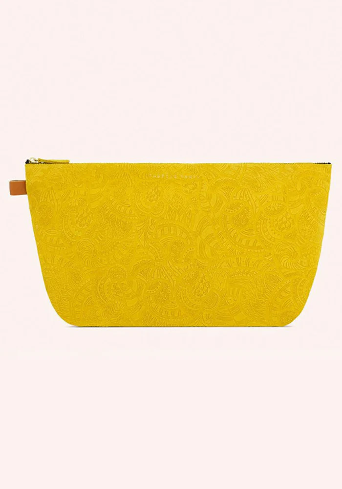 Trousse Pilow en cuir Dharma Lemon. Caractéristiques : Matière : Cuir non doublée avec détail cuir tannage végétal Dimensions : 32 x 17 x 9 cm