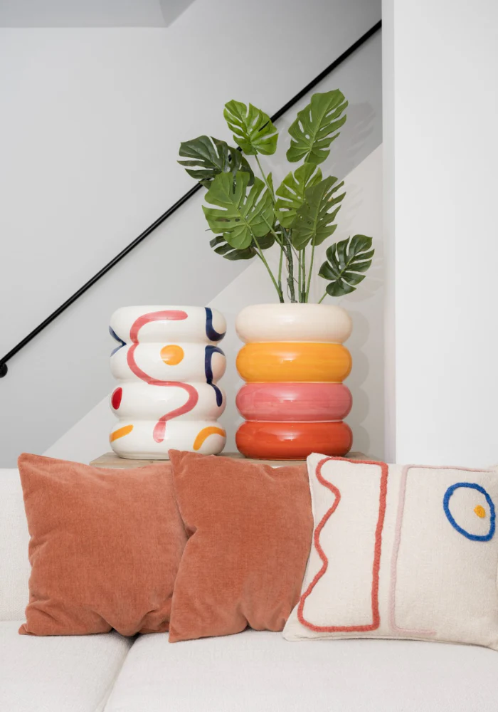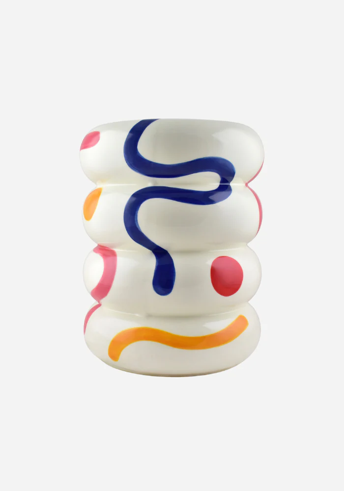 Le vase Martina Pintura Locura est un modèle en céramique blanche à quatre boudins superposés, orné de dessins bleu, rouge, rose et jaune.